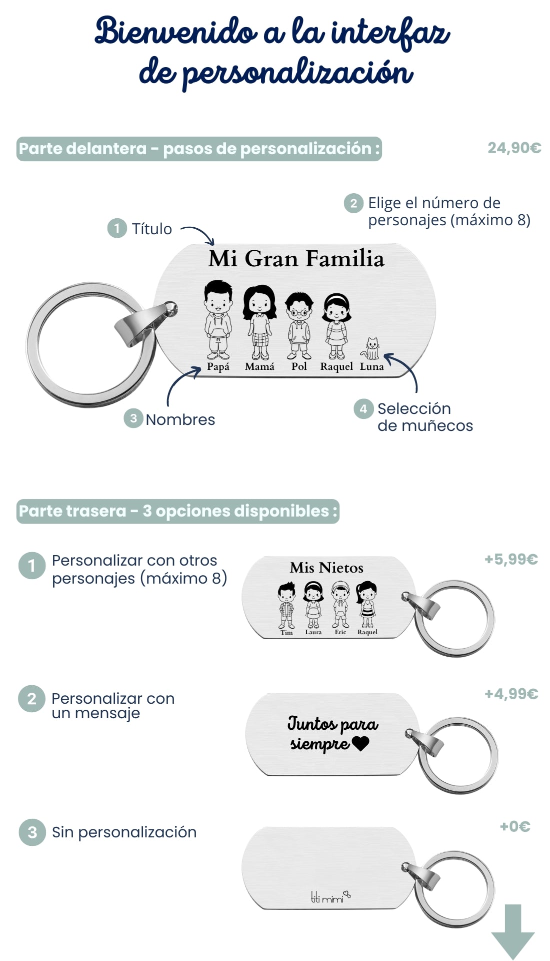 Hace más de 30 años, la aventura de Titi Mimi comenzó con mi abuela francesa, Tiffany, una apasionada de la artesanía, especialmente de la metalistería y el grabado. Un día, se inspiró para diseñar llaveros personalizados que representaran a cada miembro de la familia, para que siempre estuviéramos cerca de ella, fuera donde fuera.