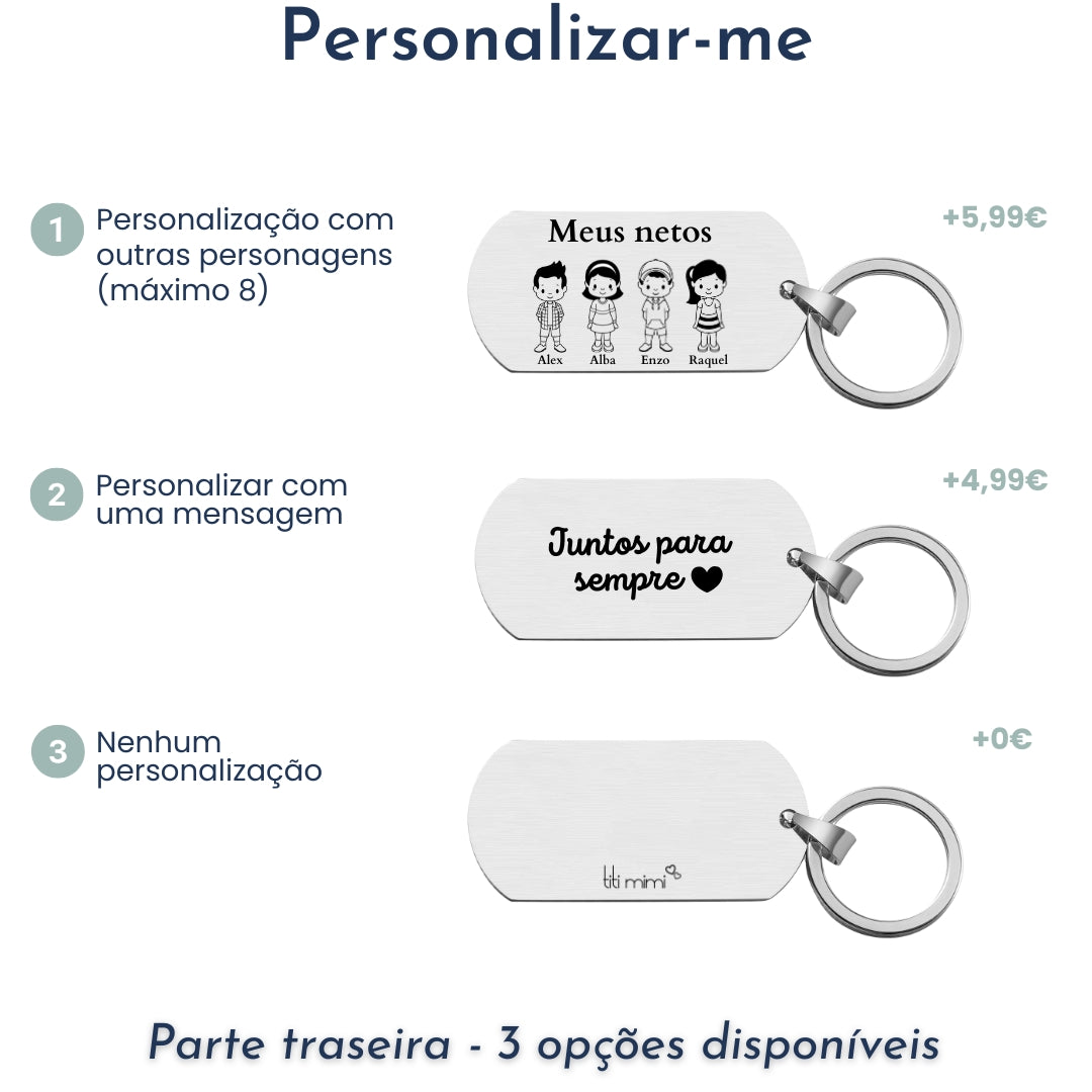 O porta-chaves Titi Mimi é 100% personalizável. Divirta-se a criar a sua família, os seus primos, os seus colegas, o seu grupo de amigos... não há limites!